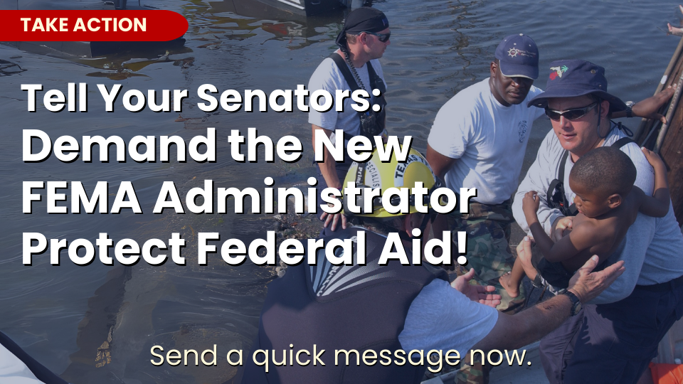 Congress has the responsibility to reverse and combat the Trump Administration's aggressive and vindictive handling of critical disaster aid, and communities can't bear another DHS Administrator who is eager to dismantle FEMA. Send an email to your Senators urging them to demand that Senator Mullin commit to strengthening and improving FEMA as a condition of his confirmation.